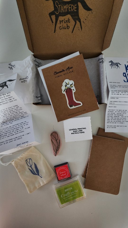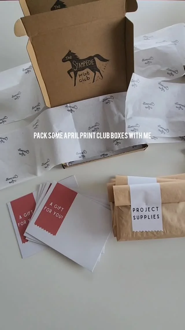 Join our monthly block print club! The Stampede Print Club is a print club where you get a hand carved block, ink pad and printing project sent to you on a monthly basis.